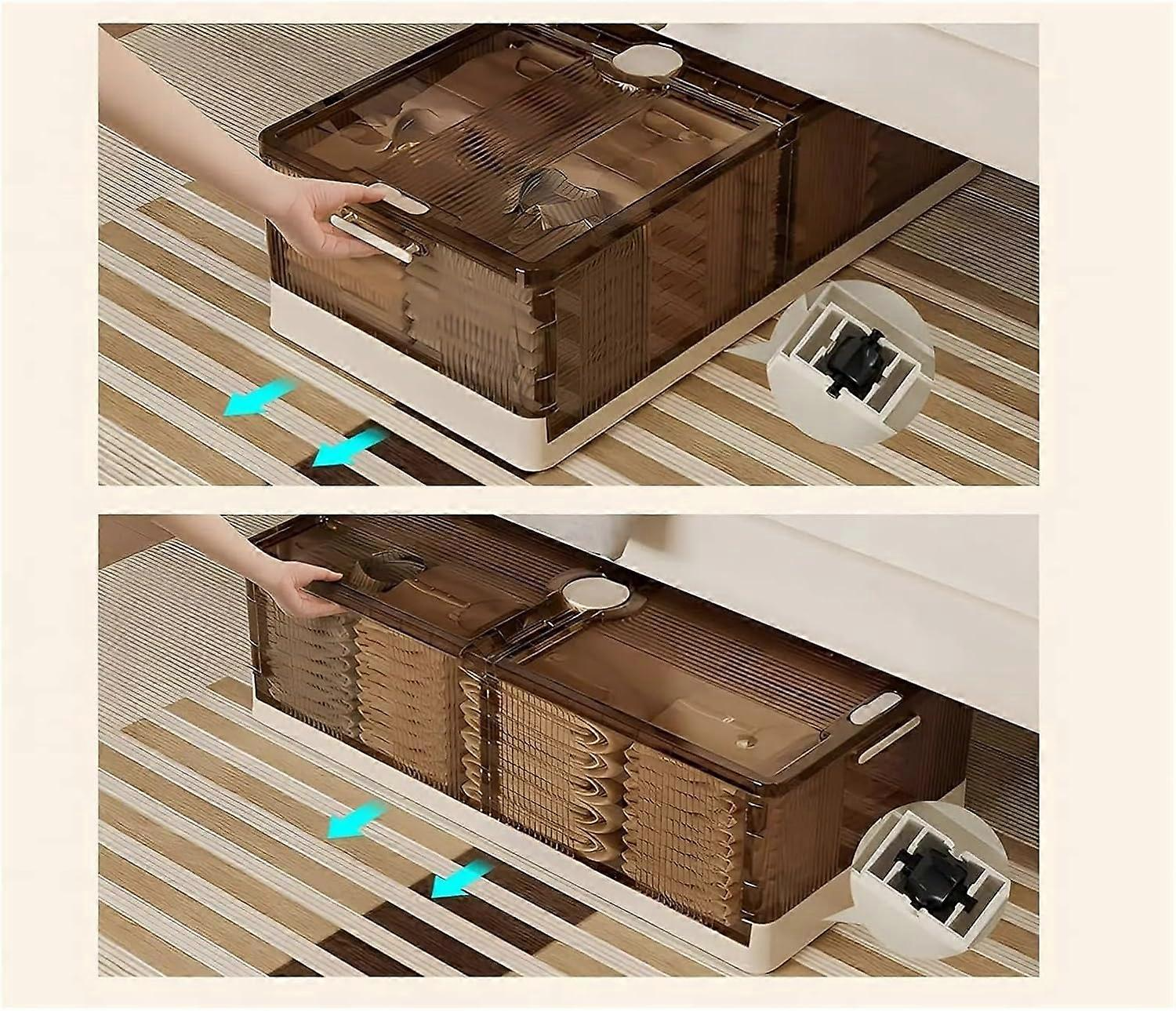 Zapomeňte na tahání těžkých boxů! Díky integrovaným kolečkům stačí jen jemně zatlačit – box hladce vyjede i zpod nízké postele nebo gauče.